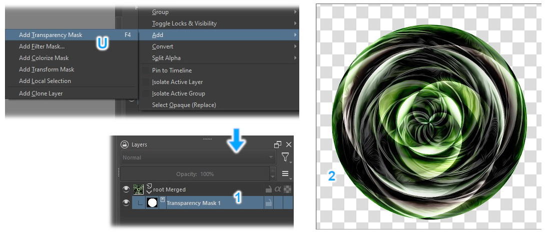 Right-click the layer and choose Add > Add transparency Mask (U). This will apply a mask to our layer (1), i.e.: everything outside the circular selection will still exist, but will be invisible to us. In this case, that part of the image will become transparent (2).