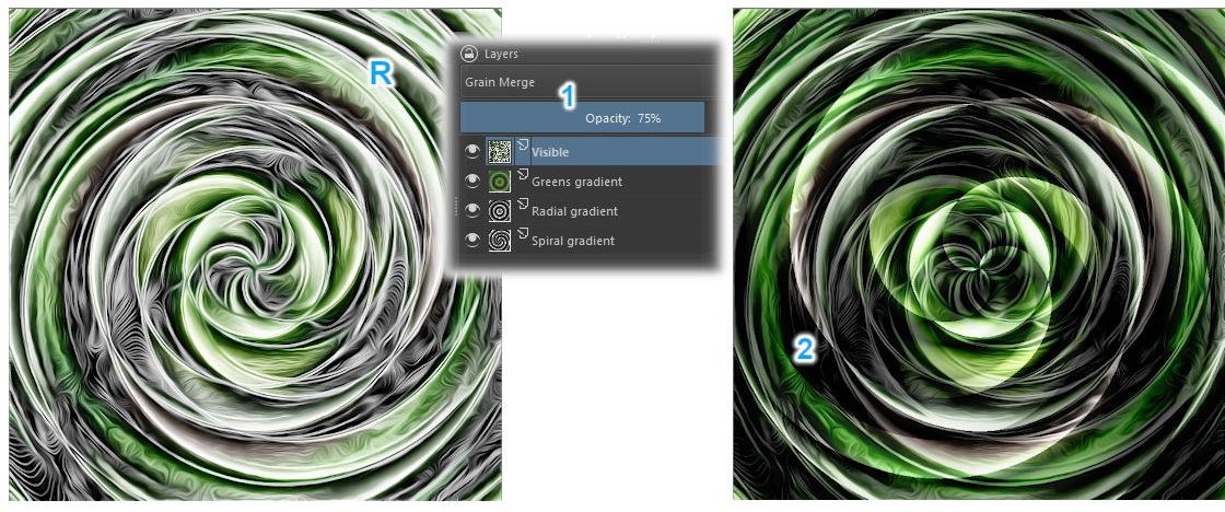 … so that our image is mirrored (R). Change the layer’s mode from Normal to Grain Merge and reduce the Opacity to 75% (1). It’s almost done (2).