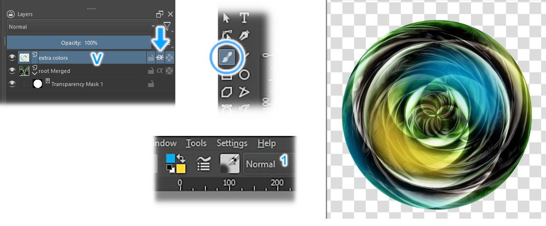 Let’s apply more colors! Create a new Paint Layer (V) and activate the second icon (blue arrow): this way, everything you paint will be within the limits of the circle. To paint, choose the colors and brush you want. I used shades of blue and light orange, applied with Airbrush (1), with Opacity of 25% and Size of 175 pixels.