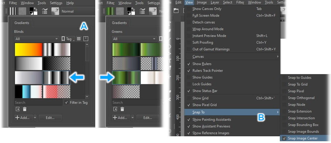 Before opening Krita, we will need two Gimp gradients, called: Blinds and Greens. On Windows you’ll find them at: C:\Program Files\GIMP 2\share\gimp\2.0\gradients. Copy the two gradients to: C:\Users\Username\AppData\Roaming\krita\gradients. When you open Krita, both gradients are already available (A).