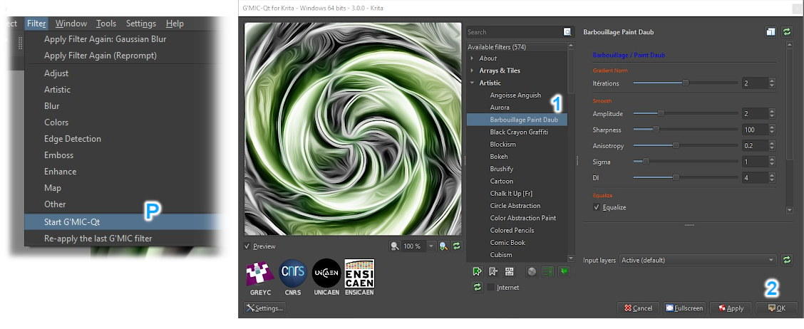 Next, we will apply a G´MIC filter, present in Krita itself. To access it, go to Filter > Start G´MIC-Qt (P). The name of the filter is the “Barbouillage Paint Daub”, from the “Artistic” Group (1). I didn’t change any filter settings, I simply clicked OK (2).