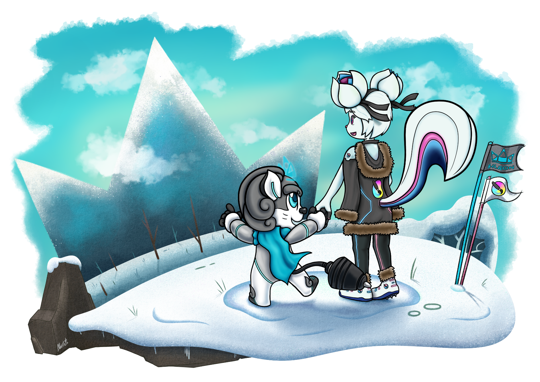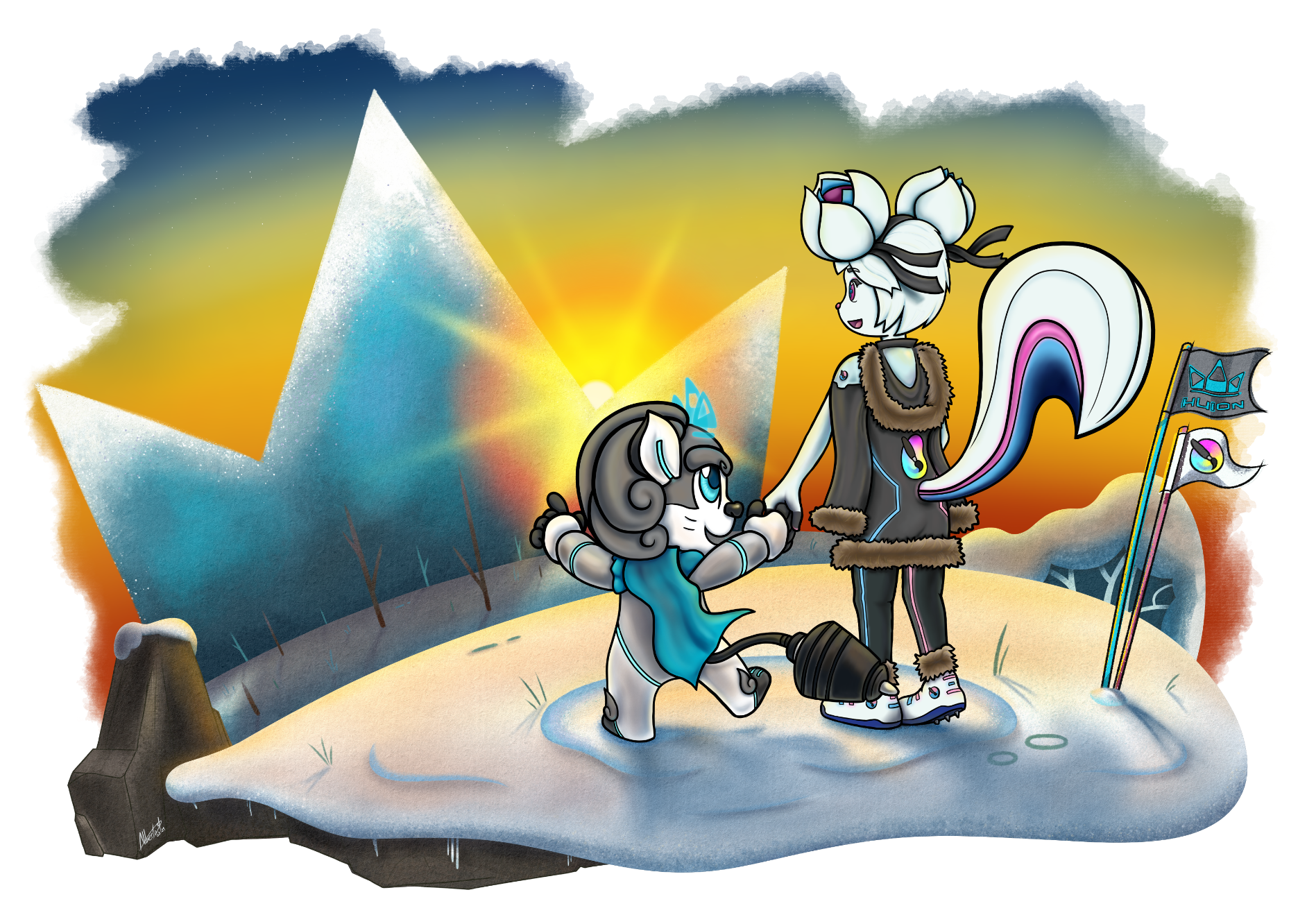 With the characters I wanted to keep their original shapes because I really like their electronic style. I downloaded various official desings of Kiki to study her forms and clothes and the result is a mix of styles with a “techno” winter coat for her. Huion only needs his cape. I used standard and basic brushes for the lineart, color and the airbrush_soft for the shadows.