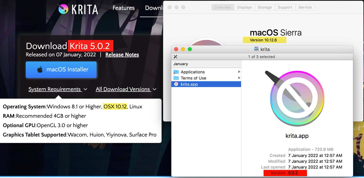 Is is possible to use the latest Krita for MacOS 10.12, or is the site’s system requirements info wrong?