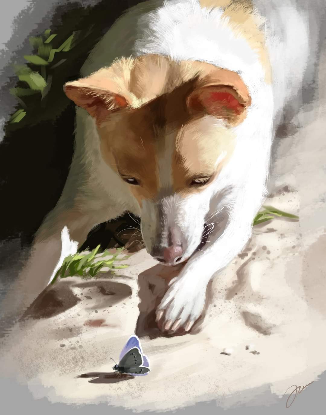 As I was taking photos of my dog, Jodi, lying in the sunlight, a small butterfly suddenly landed in front of her and she looked down at it. I snapped the shot and liked it so much I had to paint it. ![]()