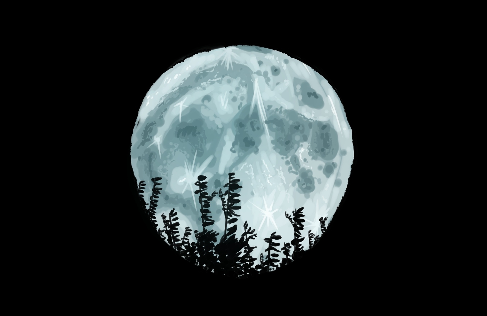 This is so pretty! I love how well you depicted the depth and textures of the moon! The silhouette of plants in the foreground makes this even prettier. I like the slight opacity changes to it so it feels like the glow of the moon reflects on the leaves. I think the star shapes made of lines on the moon are so charming. This really depicts how the moon is a gem of the sky people gaze at in the night ![]()