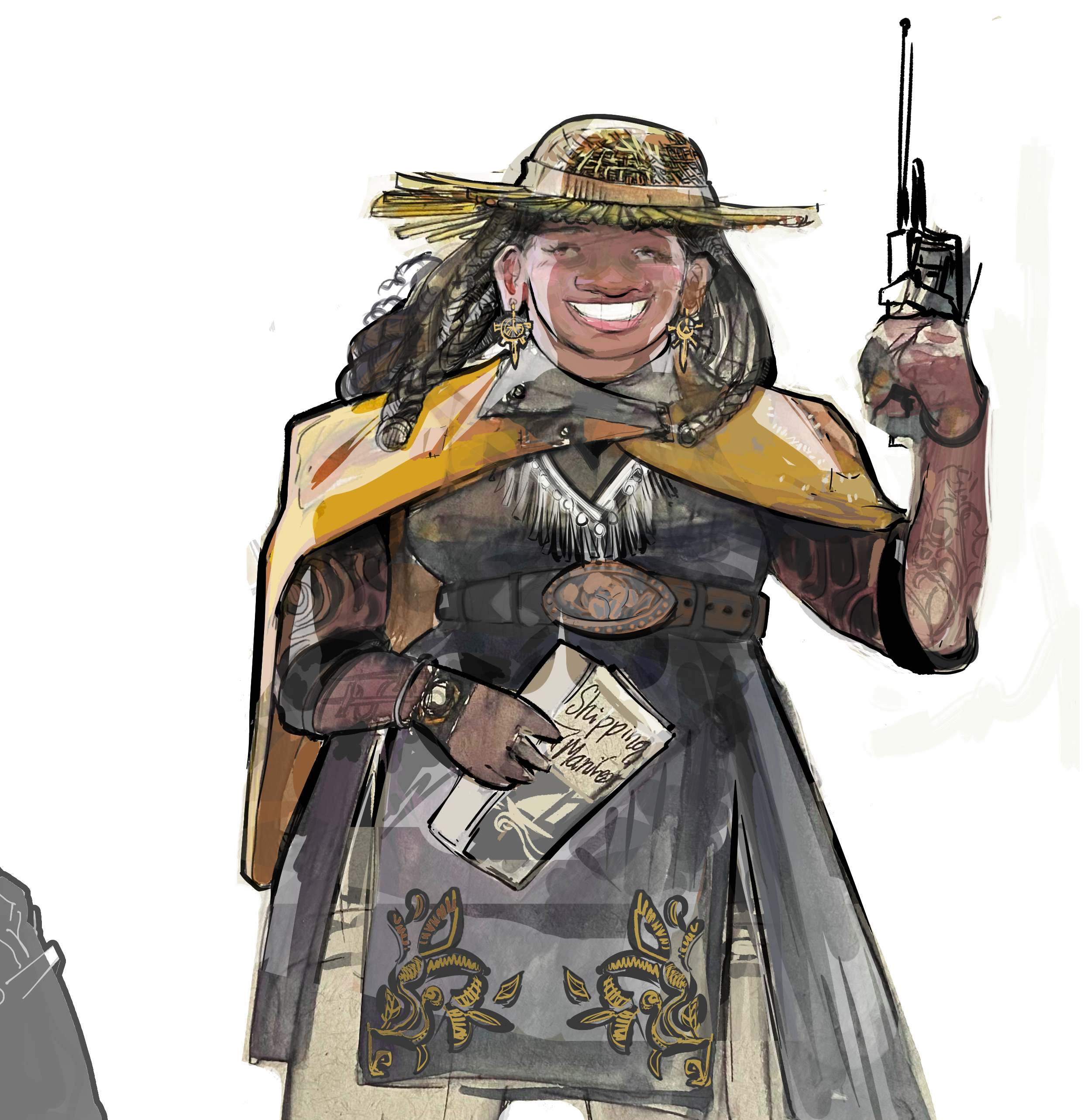 Forgot to upload this sketch of a traveling merchant who runs a motor shop from her ship. Always on the handheld seafarer’s radio to spot good deals and customers.