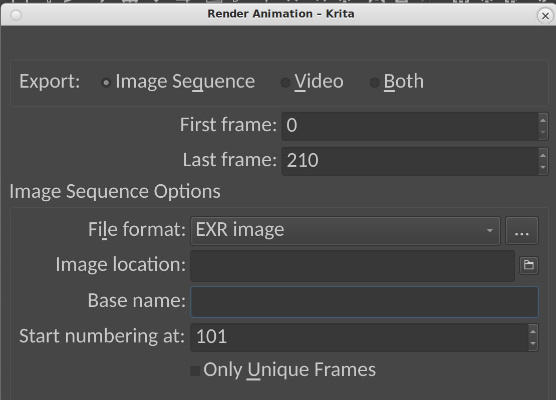 I’ve got a reference plate and I’m painting into a different layer to create fx. Then I’m turning off my reference plate and using Render Animation to export my fx work on a largely transparent image sequence. 16 bit EXRs, RGBA - flatten image selected in options.