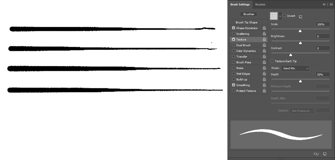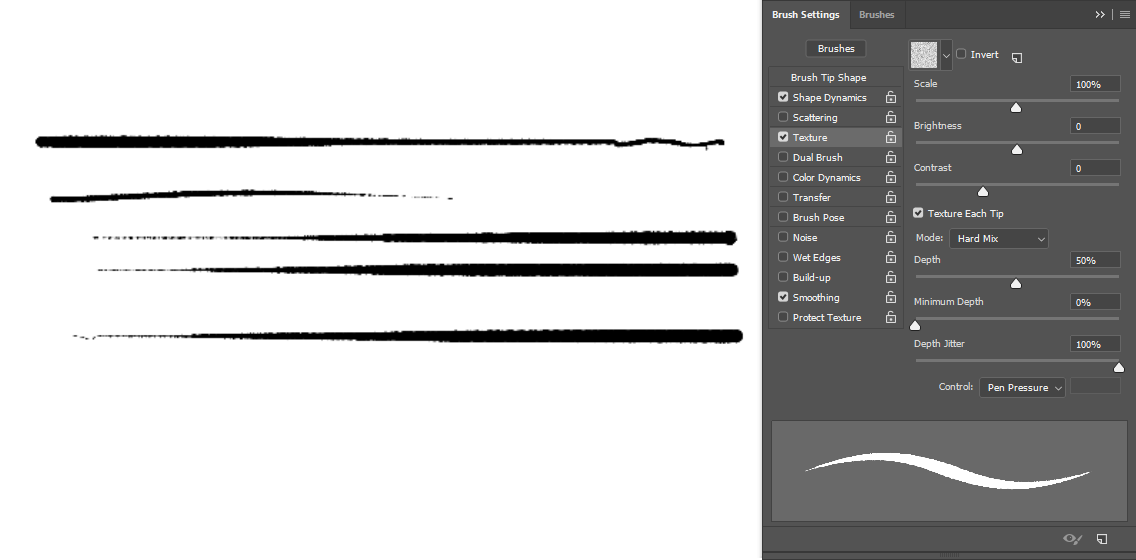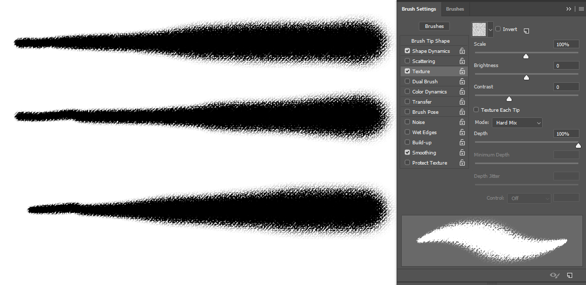 Could you please take a brush in Photoshop and cover a whole rectangle? In both modes, please. And it might be useful if you disable Depth jitter in the “Texture each tip” because that’s how it’s set up in the picture with “Texture each tip” disabled. And then maybe another two pictures with Depth on 50% to compare? (So four or five pictures, all with brush stroke covering a whole rectangle). A picture of the texture might help, too.
