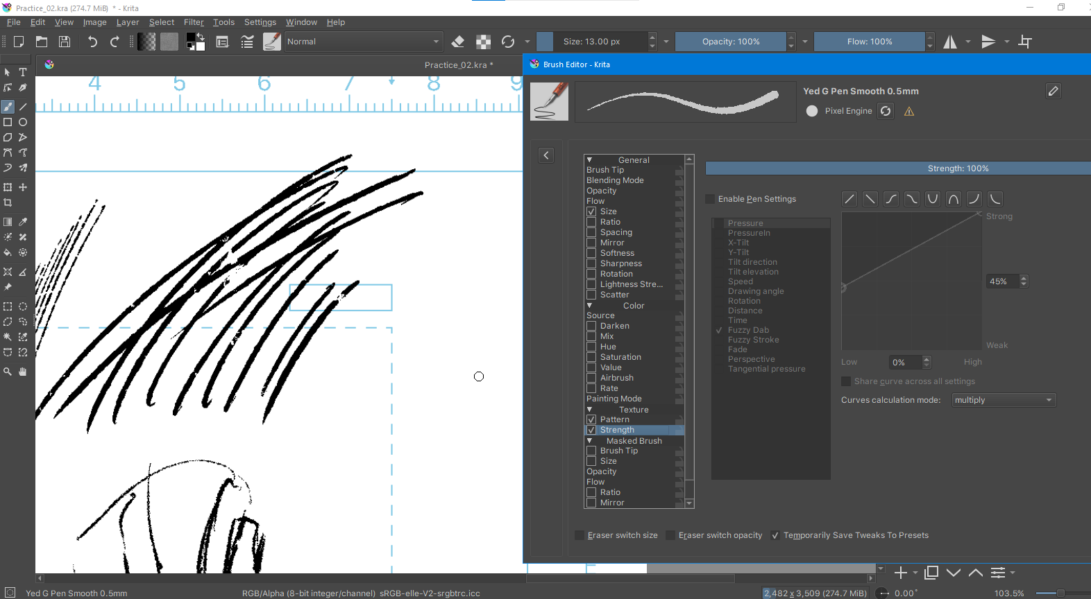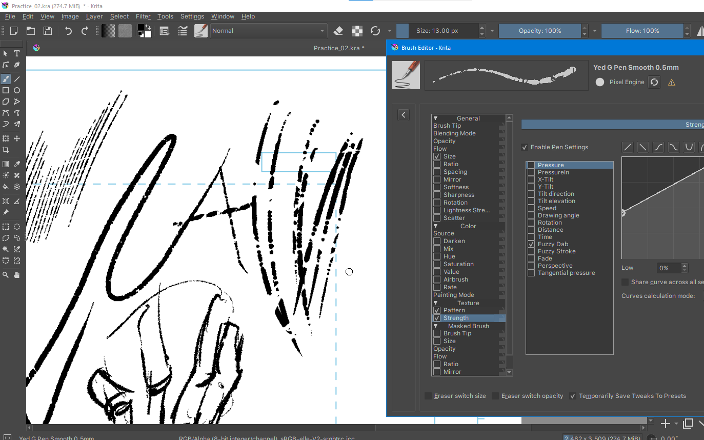 So mess with these settings in Krita also. Bellow a quick test I made with a brush using