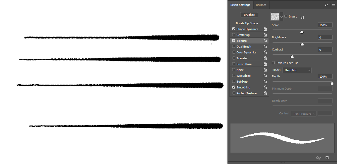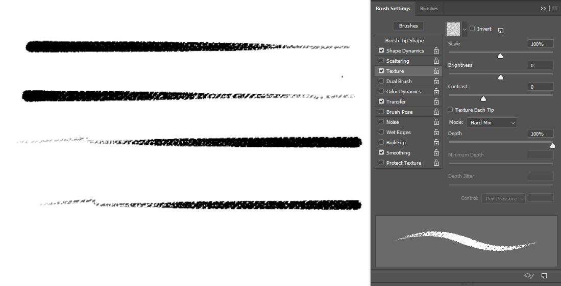 I think this demonstrate quite well the difference between the Depth from PS and Strength from Krita. My guess is that by disabling “Texture each tip” Ps applied a texture depth randomly to the whole stroke (Because Depth Jitter was at max), and this show what happens with low Depth values.