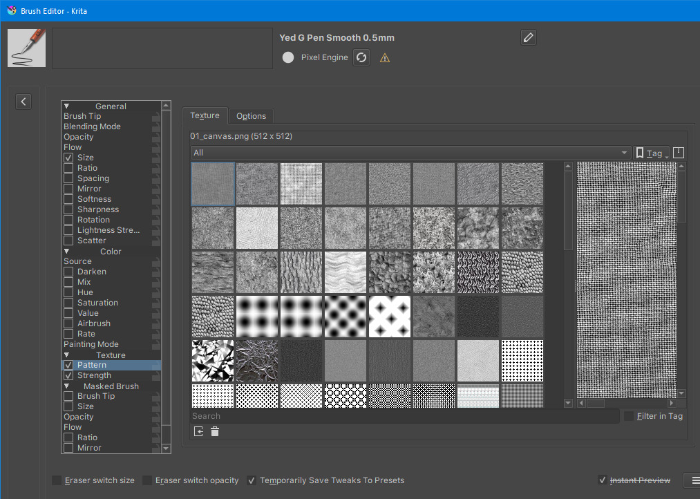 Krita also currently doesn’t give an option to switch “application of texture per tip” on or off.