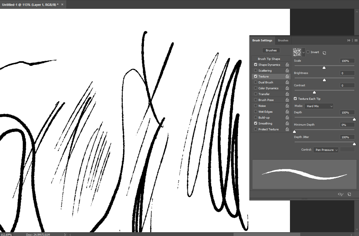 Yes, the reason I wrote this is because, well I reopened Photoshop and out of curiosity, I used a hard round brush, with opacity turned off. And just by checking the texture option, with application per tip enabled , hard mix blending mode and depth controlled by pen pressure, I directly obtained a very organic inking brush that almost behave like traditional inking pen, living a fading kind of noisy stroke when the pressure is very light, but purely opaque with textured edges when the pressure is full.