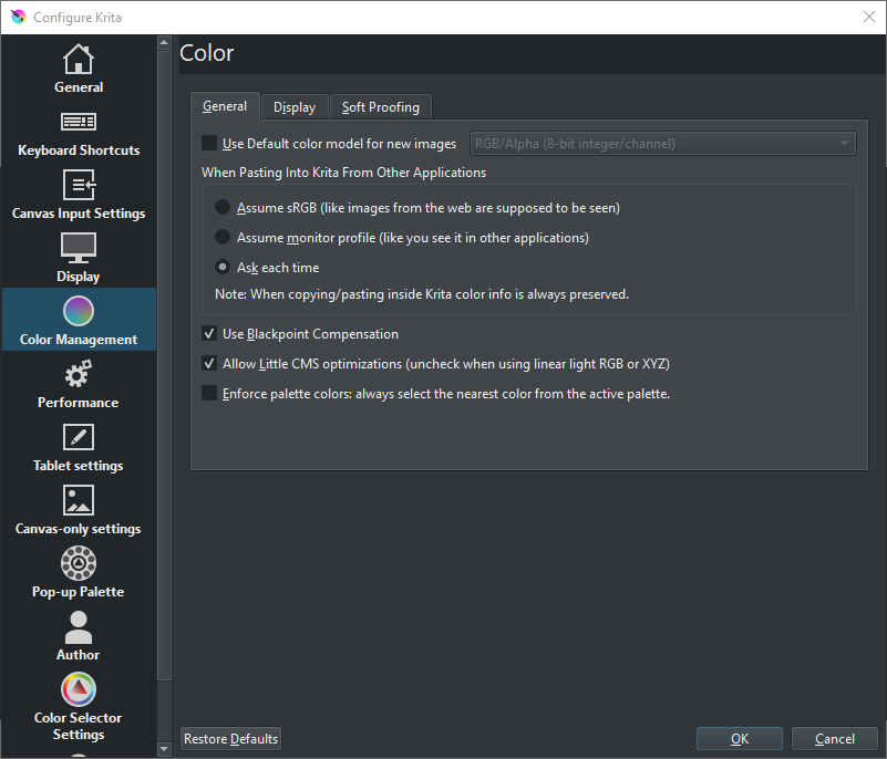 This is frustrating because the exported image from Krita is very washed out and waaay lighter than what it should be. In the “Color Management” setting I posted above I am using all of the Krita default settings. I notice it is using the CMYK model. Maybe this is the problem. Should be RGB no?