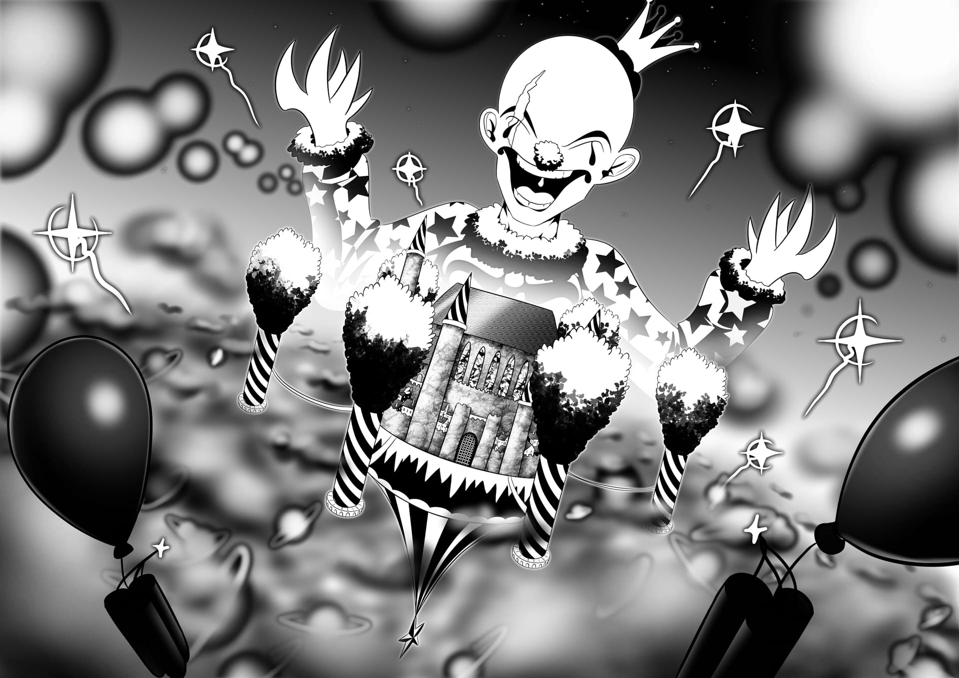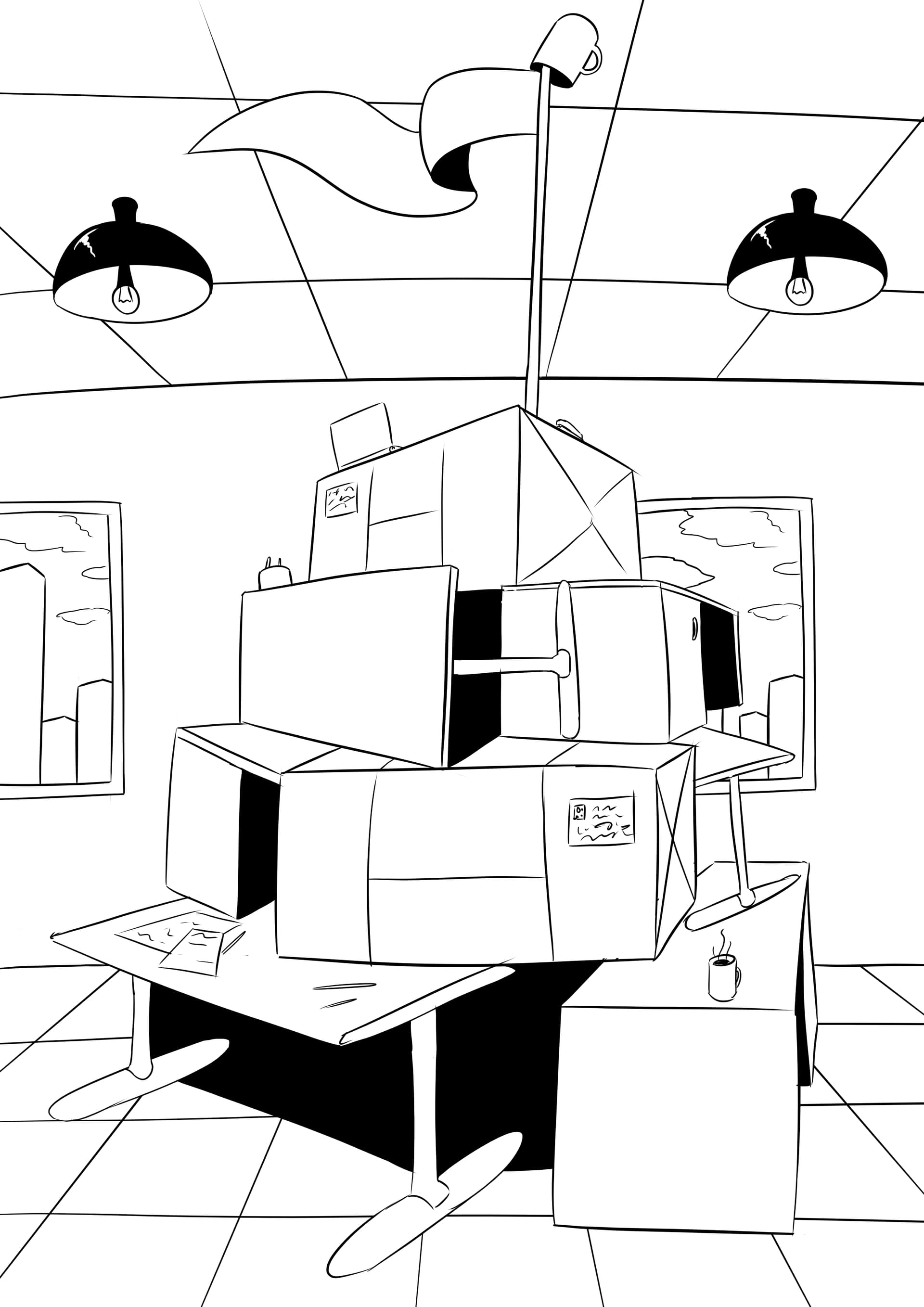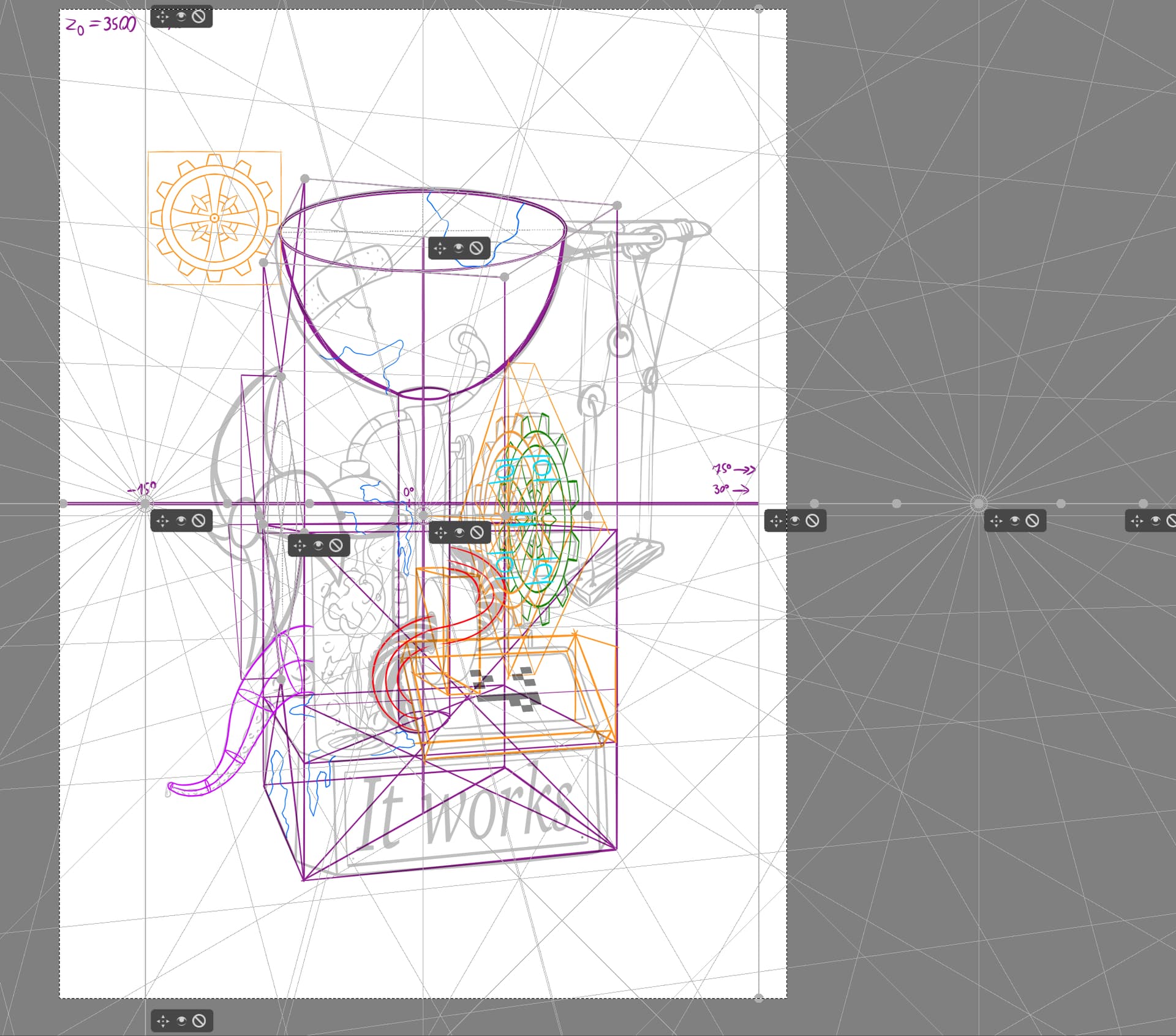 The cogwheel was first drawn as a flat 2D plan with a square around it. The multi-brush tool is pretty useful for this, since gears are very symmetrical. Then I drew another square in perspective and used the perspective transform tool on the flat plan so that both squares were exactly on top of each other. Similar method was used for the “It works” text and the pixelized emoji.