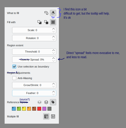 I’m going to make a standalone merge request changing the “softness” to some better term. Thinking about it I think “spread” alone can also lead to confusion and be mistaken by threshold, since some users may think it refers to the spread of the region itself. Should it be named “opacity spread” or something else? What do you think?