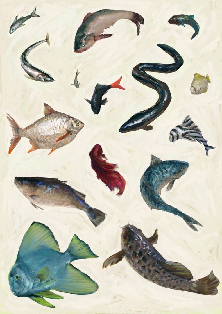 Thank you! Fishes let you make long winding animals that are also glossy or reflective as it they were just taken out of the water; they’re everything I love to paint.