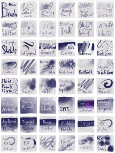 A deviantart user posted a guide demonstrating what all the brushes look like in use.