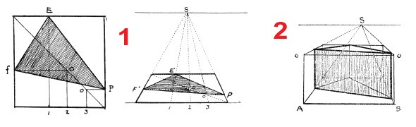 The author teaches, in detail, perspective applied to objects. There is little about the perspective of the human figure; on the other hand, you will find some useful tips. He shows, for example, a simple way to put a triangle in perspective (1), using auxiliary lines to facilitate the construction. In the case of an object in three dimensions (2), you draw a “box” and insert your object inside it: