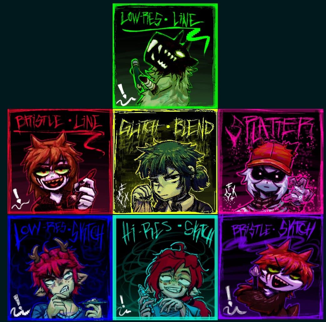 1: New icons, this is just a concept for it, but im planning to make the icons just a little bit more recognizable, last year i made them color coded, but i noticed it kind of was hard to quickly diferentiate between some brushes with similar colors, so i had this idea to give each brush a unique icon with a character of mine. I still want thoughts on this since it is just a concept.