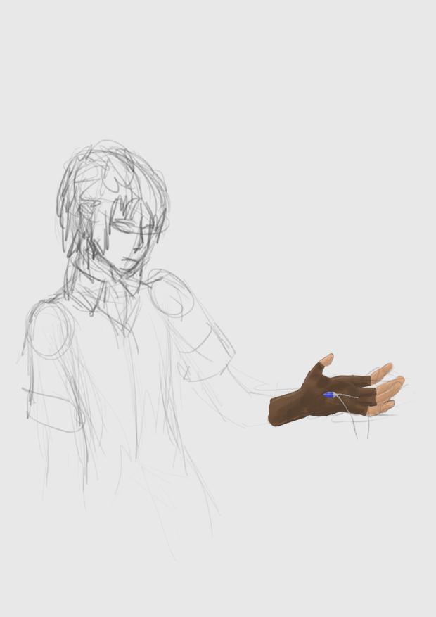 About the hand, I drew it first, using my own hand as a reference and taking up the whole canvas, then resized it. I figured I’d never be able to draw the hand without a reference, and I couldn’t draw the body without loosely using a reference either, so they ended up weirdly mismatched.