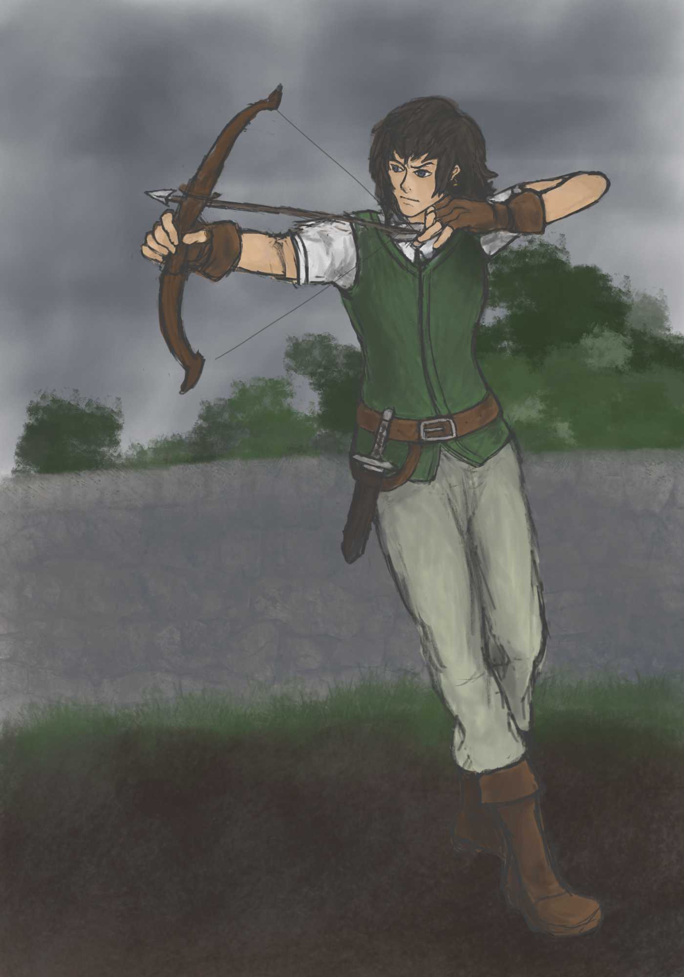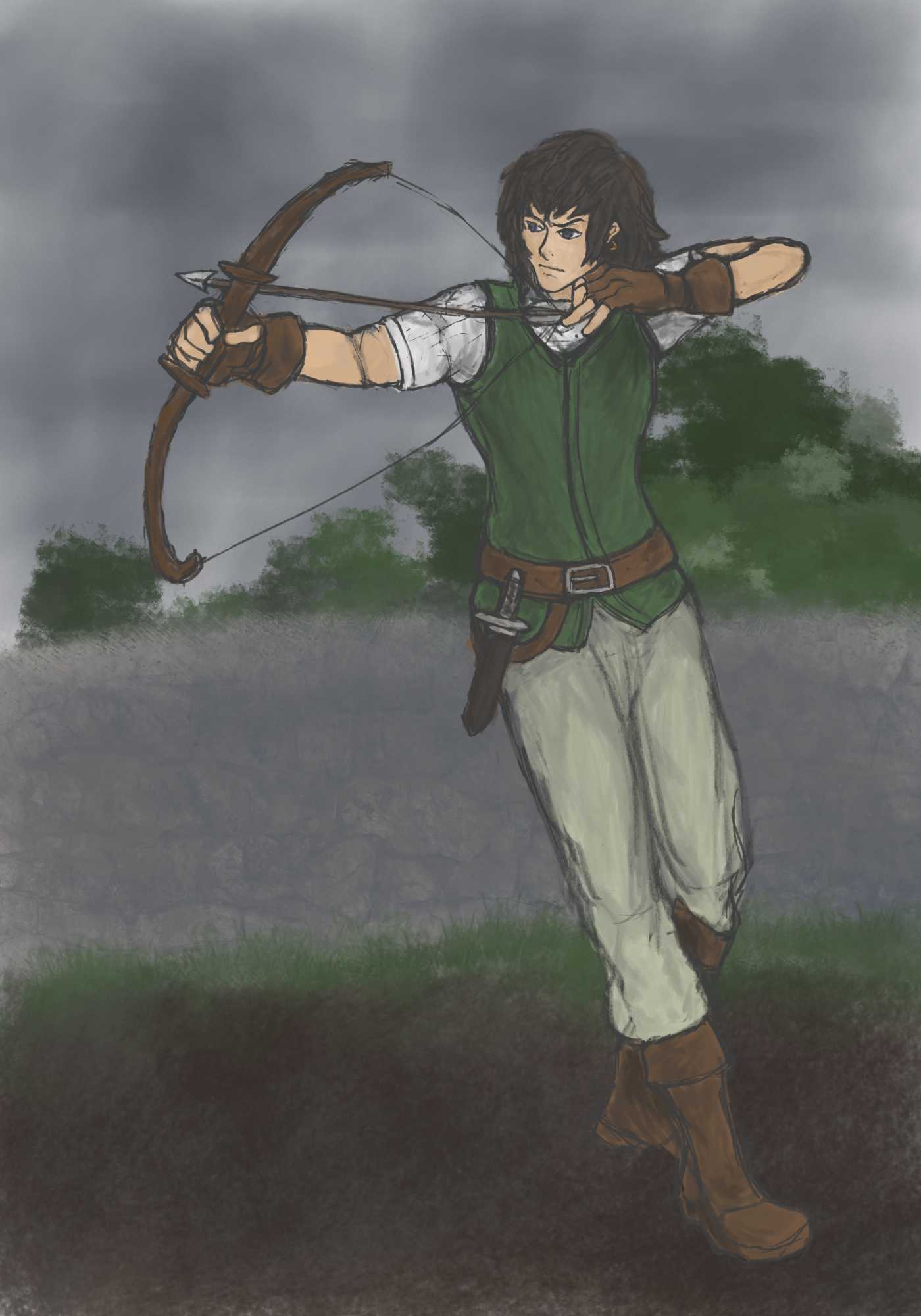 It’s getting to the point where I spend an another hour on it and it feels like barely anything changed. But I did change some things. Raised and straightened her arm somewhat, redrew the bow to be less weirdly distorted (although it still is a bit wrong.) (And also the arrow is now curved because I moved only part of it.) Pretty sure I made the left arm worse. Made the dagger larger, maybe she’ll give up and throw it at the target instead.