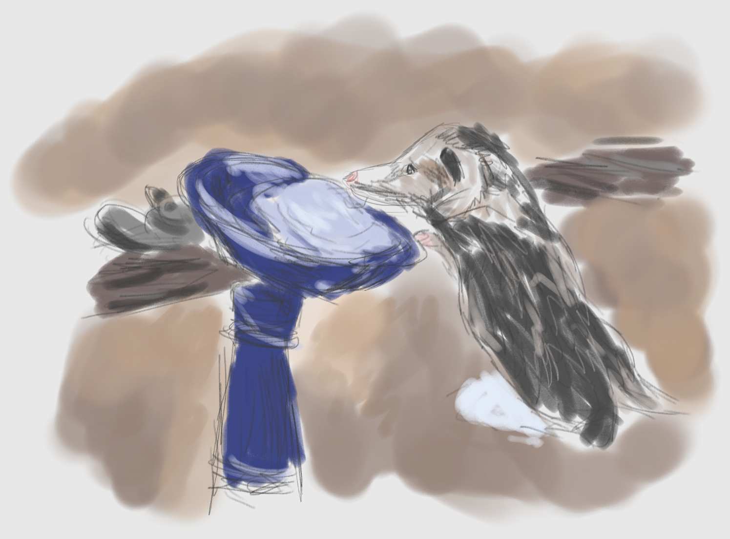 Cats aren’t the only larger animals (larger than a bird or squirrel or bugs) trying to get a drink from a birdbath. Unfortunately opossums aren’t as agile. This one is caught in the act of tipping the top of a birdbath onto its head (ouch?) to drink the spilled water. The white spot on the ground next to it is solid ice, evidence of a previous attempt (it was around freezing at the time).