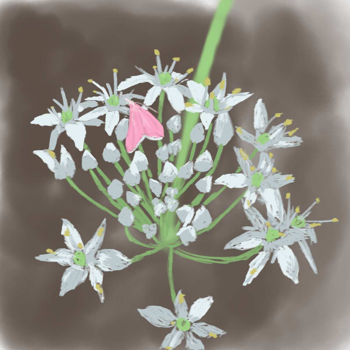 Chive flowers with a pink moth, an inornate pyrausta moth or something like that. From a photo as usual.