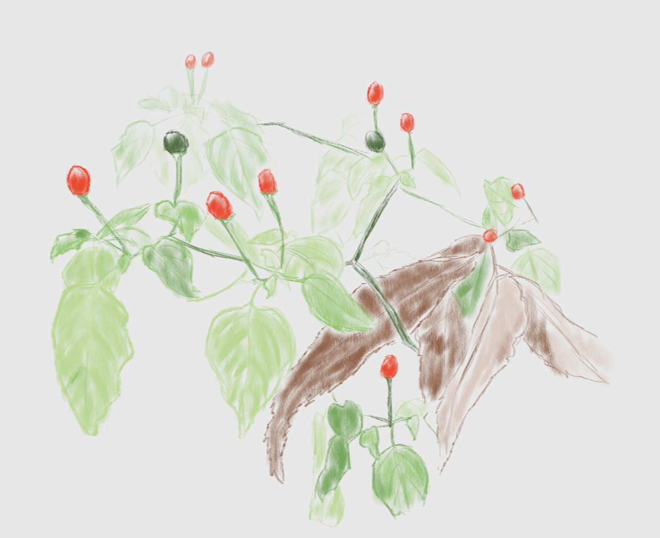 Sketch of a chile pequin plant, based on a photo. Very small and very spicy peppers, too spicy for me to want to try. The large brown leaves are fallen pecan leaves (not that it’s possible to tell from this).