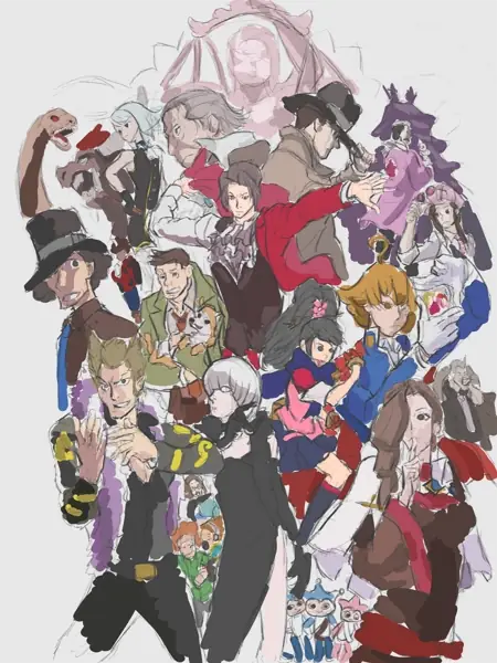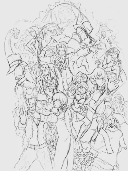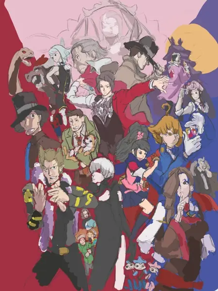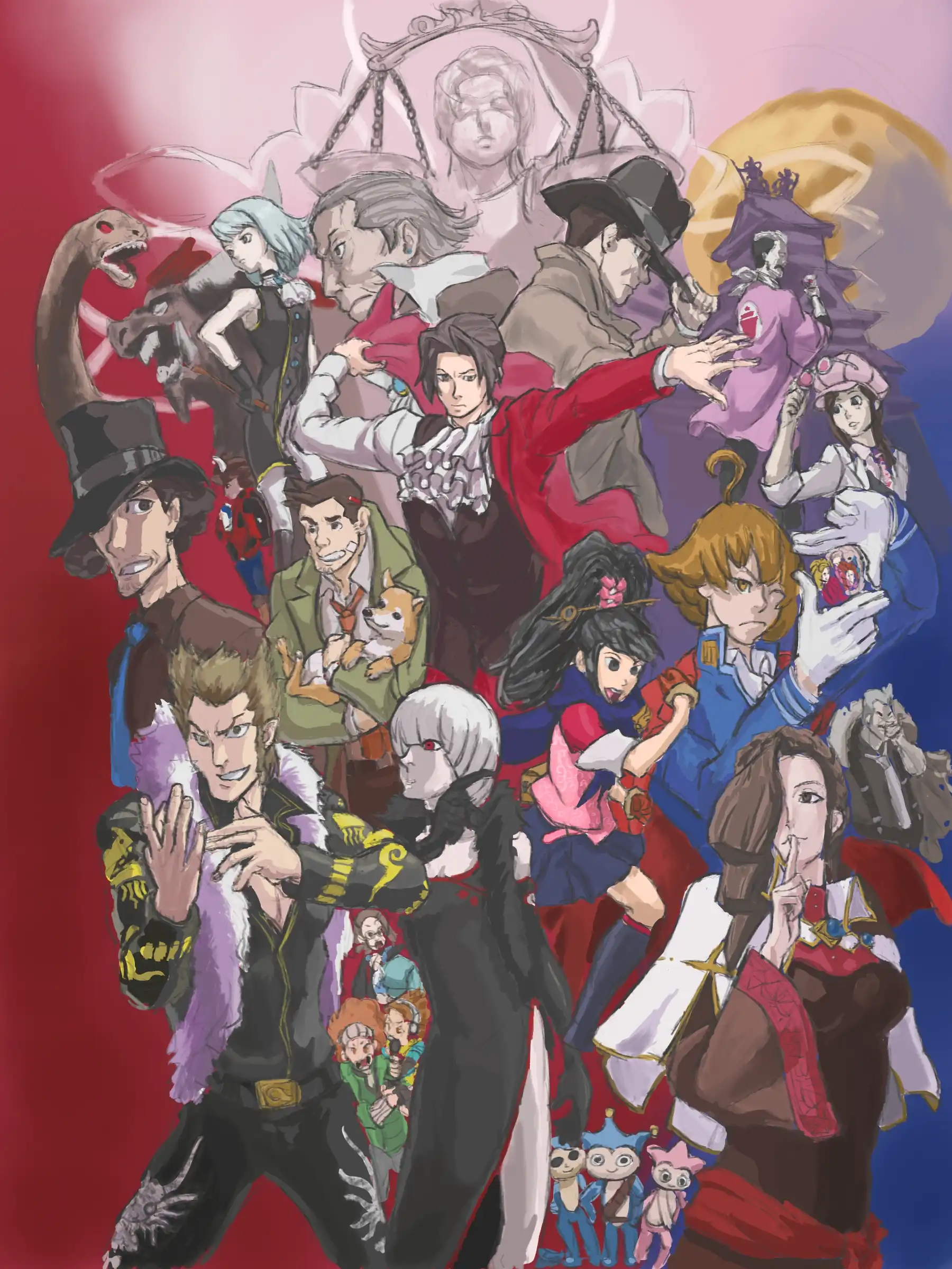 Fanart based on an official illustration (the boxart) of Ace Attorney: Investigations Collection, featuring the main characters of the duology (Miles Edgeworth and friends/enemies.)