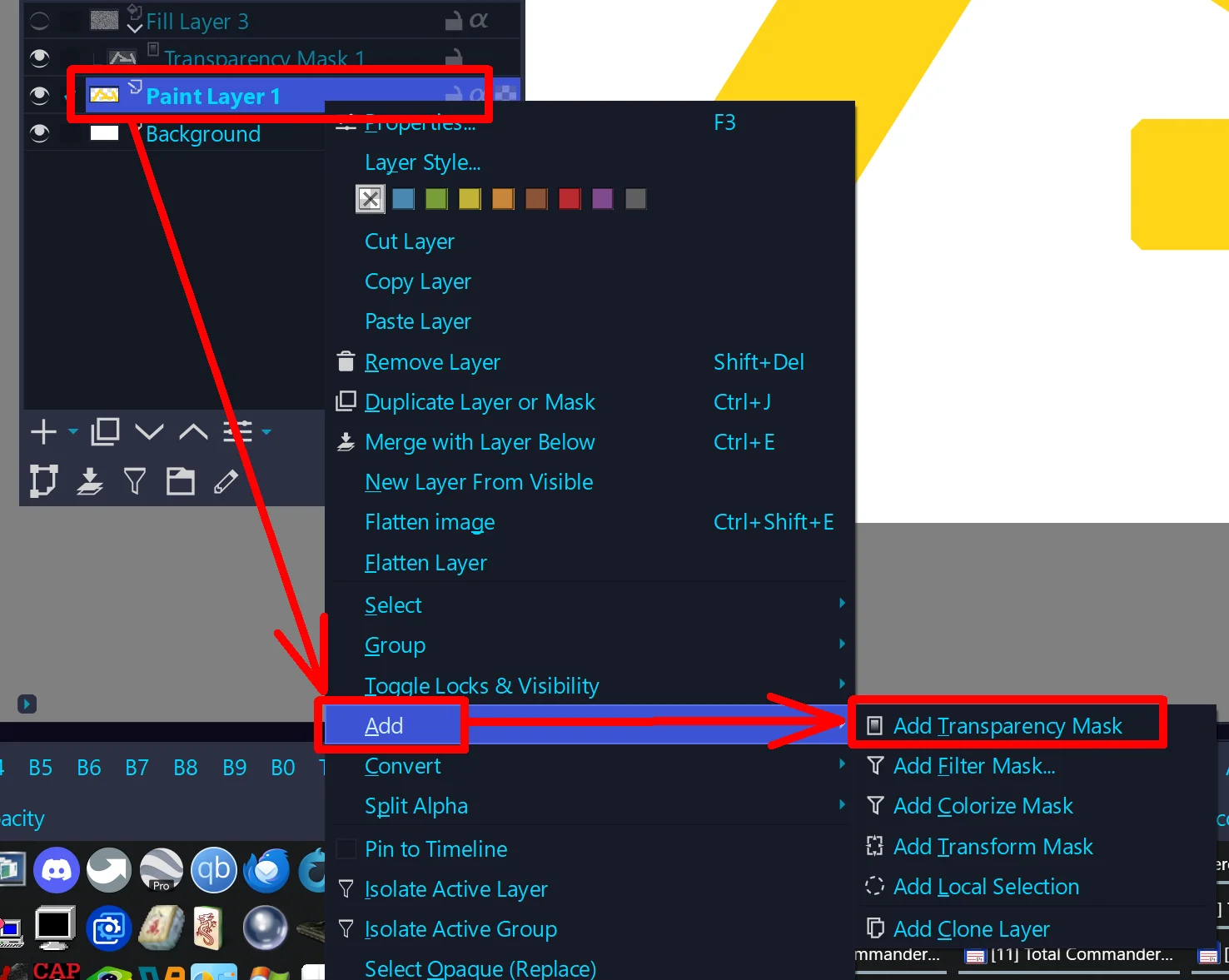 You have to select the eyedropper as tool and then select the french fries with the eyedropper, when the marching ants show up around your french fries you do a right-click on the layer with them, here layer 1 and select from the opening drop-down menu “Add” >> “Add Transparency Mask”. And then, as you can see in the first screenshot, you have to grab and move this Transparency Mask and drop it onto the fill layer, and it will position itself automatically below the fill layer.
