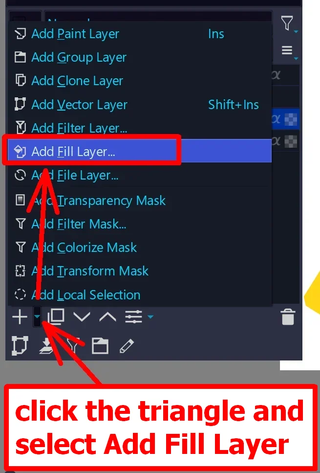To create the fill layer you have to click on the tiny triangle right beside the + -sign at the bottom of your layers docker and select Fill Layer.