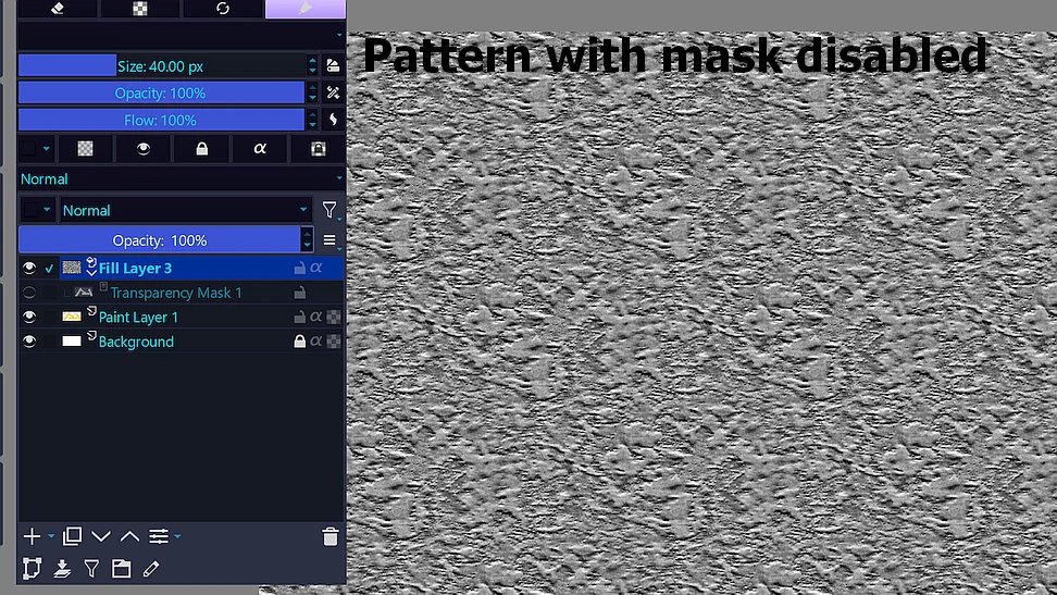 - “texture” is a fill layer with a texture on it (“paper grain B” in this case). It has the alfa icon toggled (it can be done by clicking on that icon). It’s the “inherit alpha” option which means it inherits transparency from the layers below this one, so where there’s nothing on them, the texture from this layer also won’t be visible.
