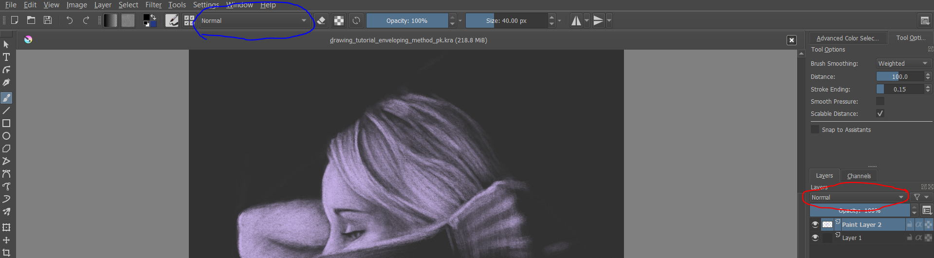 screenshot attached. layer blend mode setting circled red, brush blend mode setting circled blue