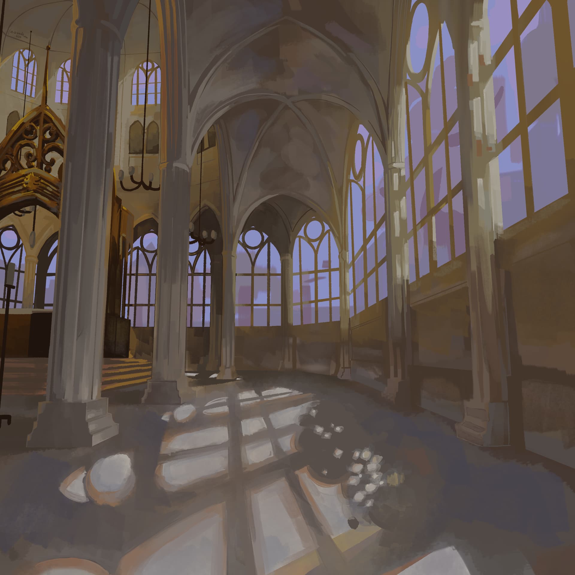 I remember I had fun with the brushes on this one, I always loved mixing lots of brushes that had nothing to do with one another, it gives it more “life” in my eyes. I had trouble with the perspective, I couldn’t figure out that slow turn these buildings have (the so-called “Apse”). The colours on the windows were also a headache : / I wanted a normal tint for those but I realized midway that’s not how some windows work in gothic churches (some have saturated colours to them), but I already had finished my work on the floor so… the result looks disjointed because of that XD and don’t even get me started on the lack of support in the outer walls of the church lol
