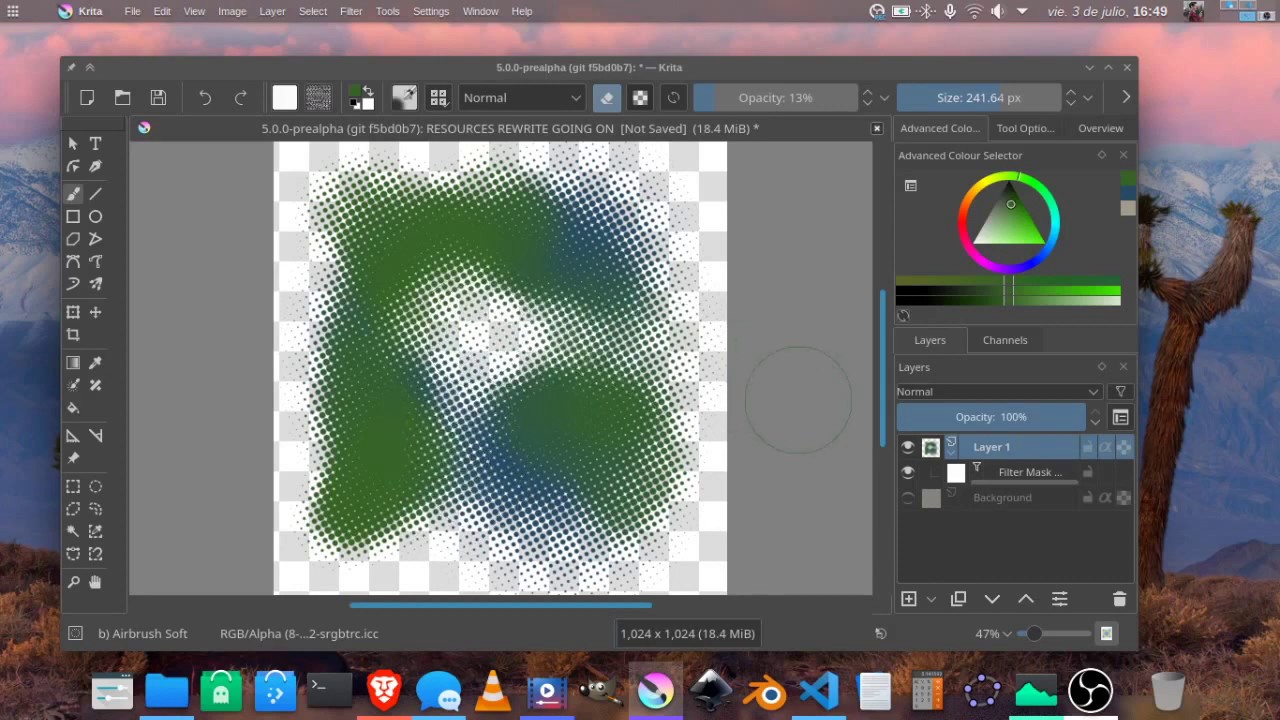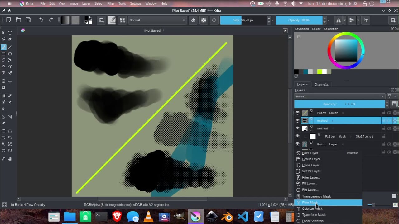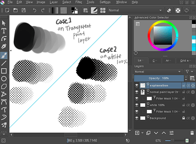 Although we think it’d be better to just implement the behavior(Taking both color, alpha into the consideration) into the halftone filter itself. Building all the group layer structure seems unnecessary.