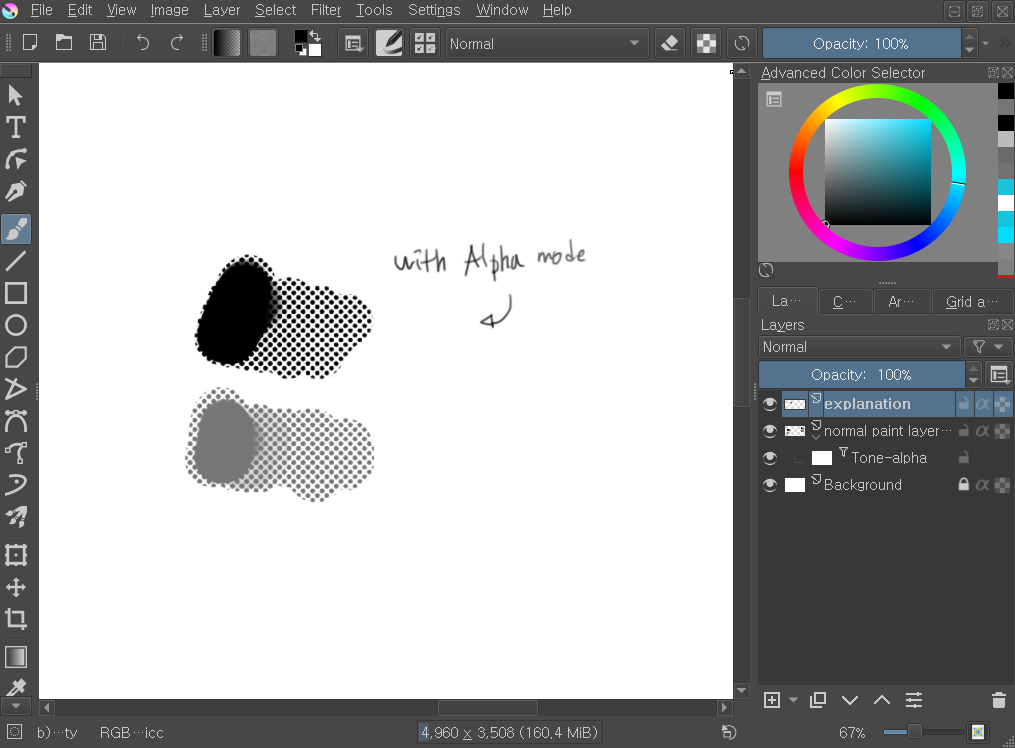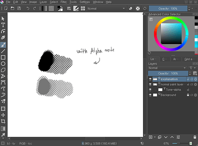 I’m not sure it’s just us, but when we adjusting strength of tones, as like we paint, we usually both use transparency created by eraser and opaque colors(And later we merge it to the bottom if we’re painting). So making the halftone based on both the layer’s opacity and color will make it far more simpler to control the tone strength. Right now we have to use blender brush and other workarounds to create tones that have gradiants, complex patterns, etc.