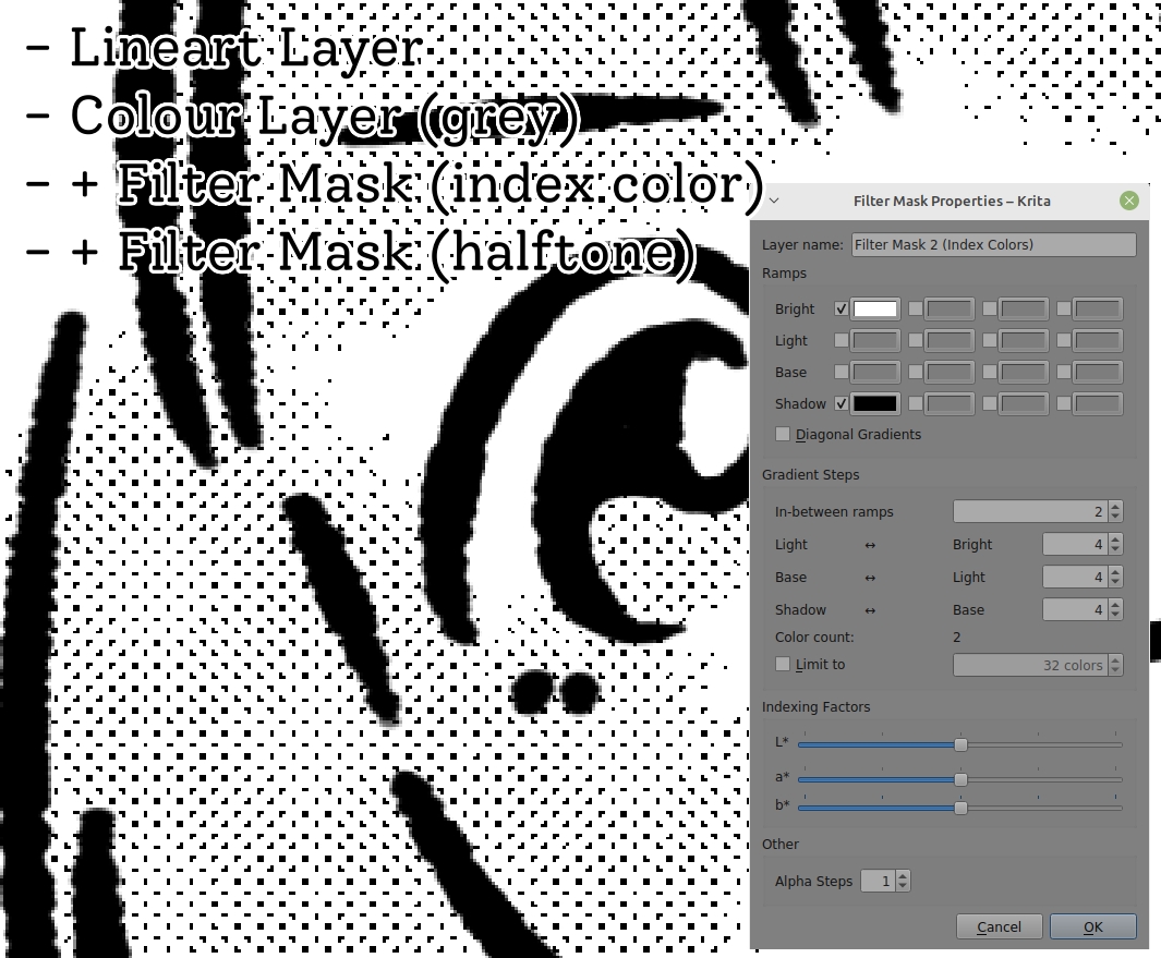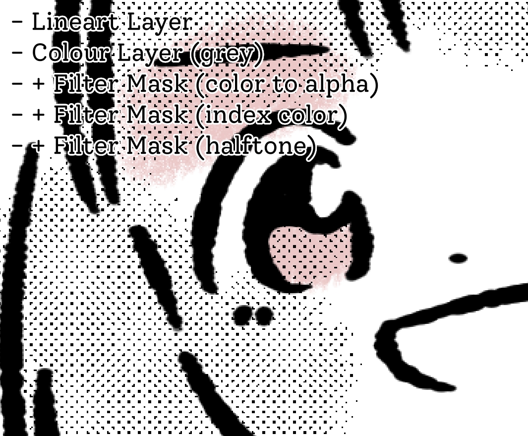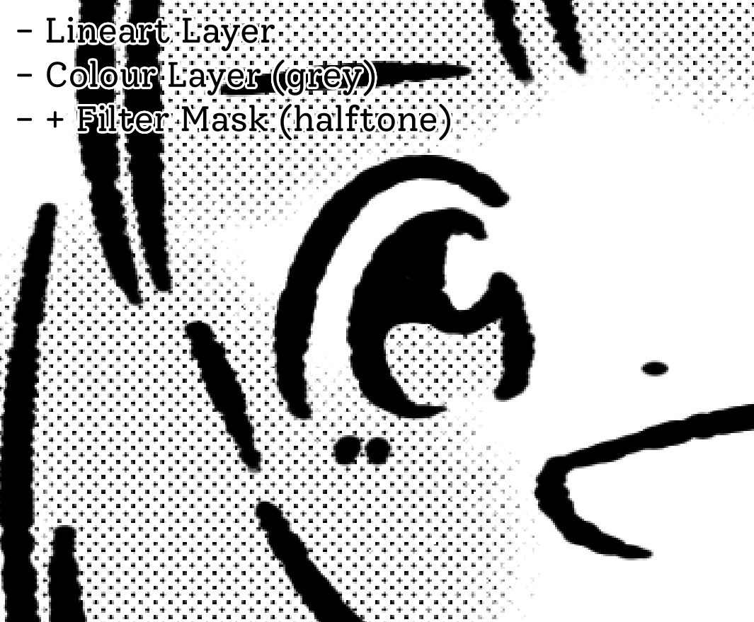 *We forgot to mention in the picture we posted, that one more negative of painting on an opaque white layer for halftone mask is that, the filter(mode:intensity) would just lower the opacity instead of reducing the particle sizes when you softly erase any of the layer purposely to lower the ‘tone strength’, not actually to lower the opacity.