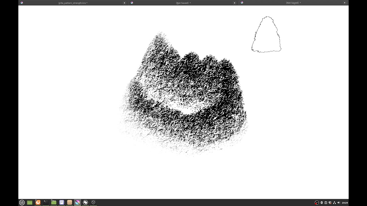 Pattern strength mapped to pressure and to tilt elevation. The latter is set up so that as the pen reaches the most upright angle, the pattern strength is boosted to max so that the pattern has the least effect possible. (It still kind of gets me that higher strength is less pattern effect here)