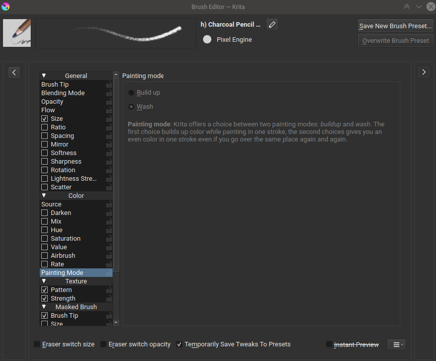 I want to use a brush with a low opacity, so that when I hold the same pressure and go over the same area it will ‘build up’ over itself and get darker each time. How can I do this in Krita?