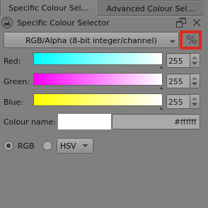 Is there a way I can change the depth/format so that Red, Blue, and Green scales to 255 as shown? Preferably with a slider for each color along side a typable number value box. RGB255