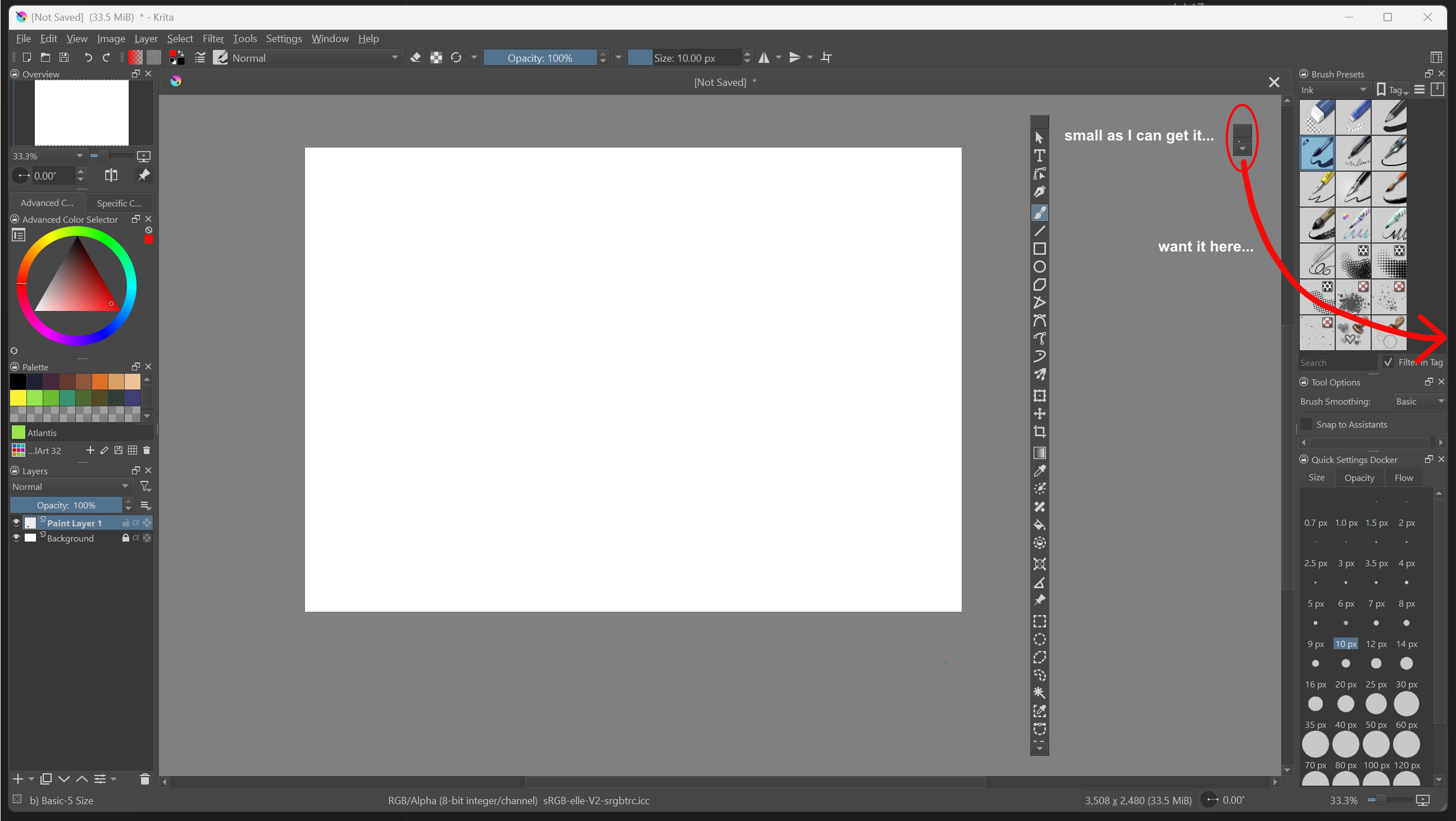 Anyhow, if you do have time and do not mind, I would appreciate you making the workspace for me to import. The picture below shows what I want, which is to have the Tools docker in its own column to the right of the column containing the paintbrushes and stuff (I am left-handed so have everything set up the opposite of everyone else).