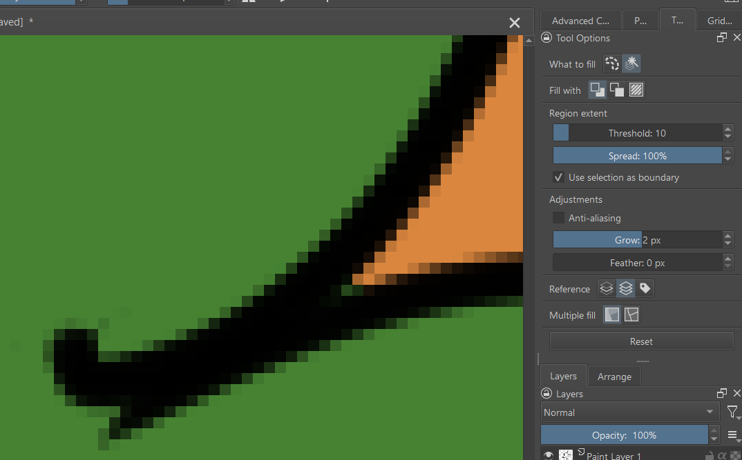 In corners where two lines meet, the fill bucket tool often doesn’t fill in the corners. If I turn up grow, then it goes outside the lineart when it fills the corner. And if I turn up threshold, it doesn’t work when I’m filling in stuff that’s not completely black and white like shadows. Do I have to fill in the corners manually?