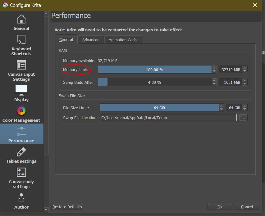 I’m making an animation on Krita and on the bottom right-hand corner there’s a bar that’s almost red. When clicking on it reads “WARNING: Out of memory! Swapping has been started. Please configure more RAM for Krita in settings dialog.” I looked up how to fix this on google, and most of the suggestions say something along the lines of Go to “Settings → Configure Krita → Performance and check if you can add more memory for Krita”. But I cannot find the “configure Krita” tab in the settings. The application has been acting very slow and glitching. I’m scared I will not be able to finish my animation. If anyone can help me it would be appreciated!