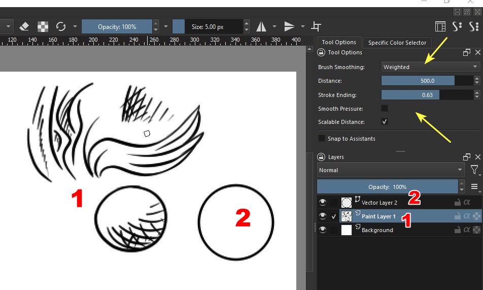 I rarely use Stabilizer; the Weighted option works well for me. In this example, I traced with this option enabled, using a 5-pixel G-Pen brush on a Paint Layer (1). The circle I traced is somewhat oval, but acceptable for a quick demonstration.