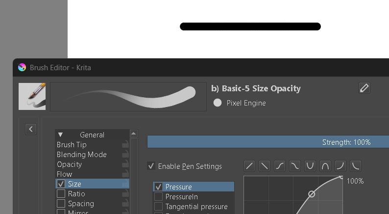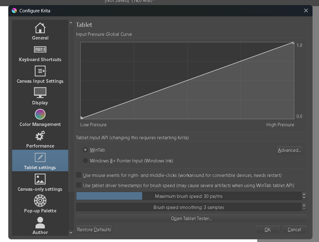 Is pressure sensitivity working? You can test it in Krita’s tablet tester (it’s inside Configure Krita). If you have pressure, you’ll see stylus movements in the text output, not just mouse movements.