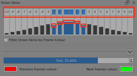 I’d suggest that you get the Onion Skins docker showing and then select the ones you want by enabling them by toggling them in the upper number row.