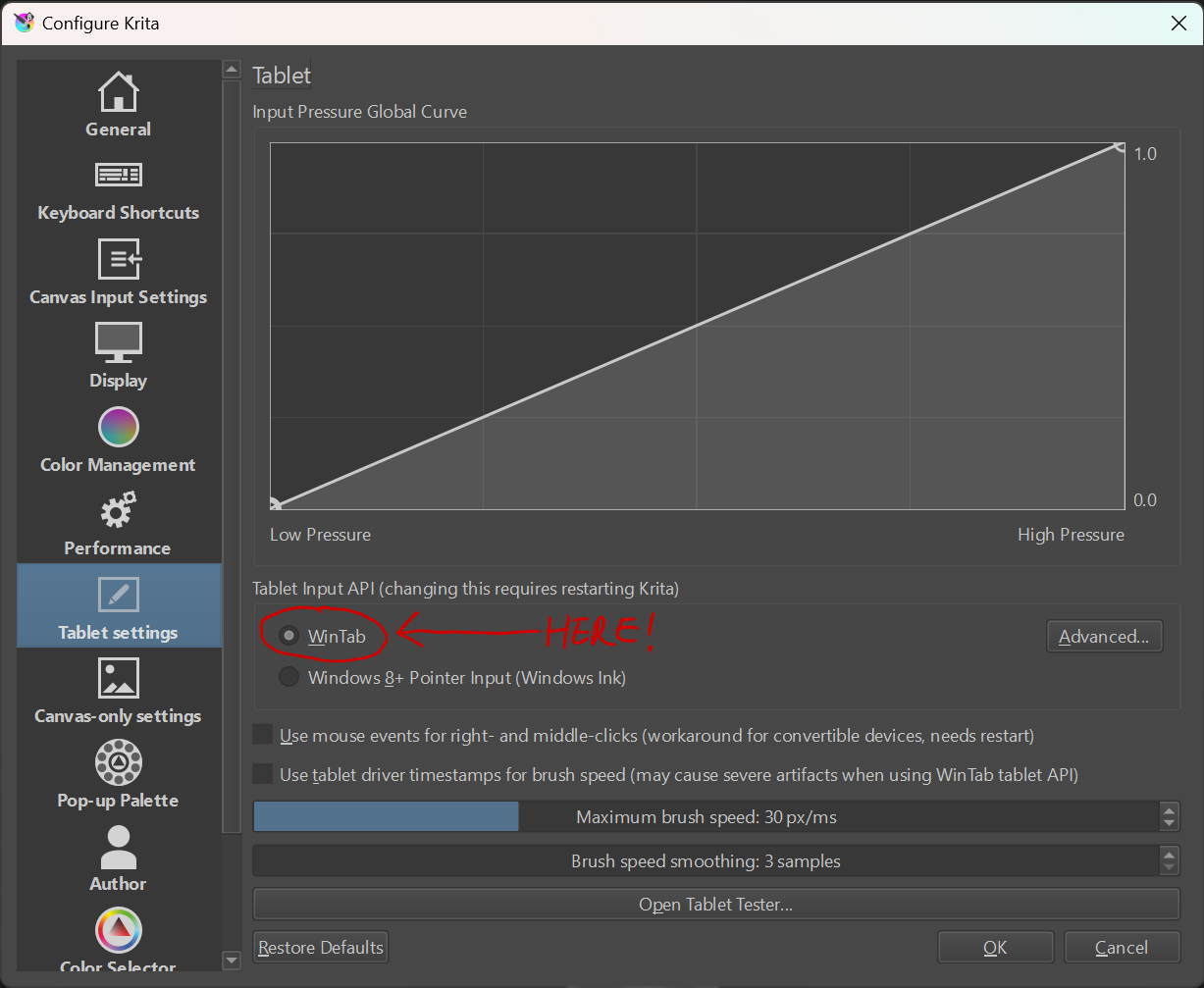 (Windows specific) Your experience my vary, but in my case tablet works best in WinTab mode (not Windows Ink). You need to change it in the driver UI and in Krita, both settings must match. In Windows Ink mode, sometimes it will add lag when you put the pen tip down. Change it here: