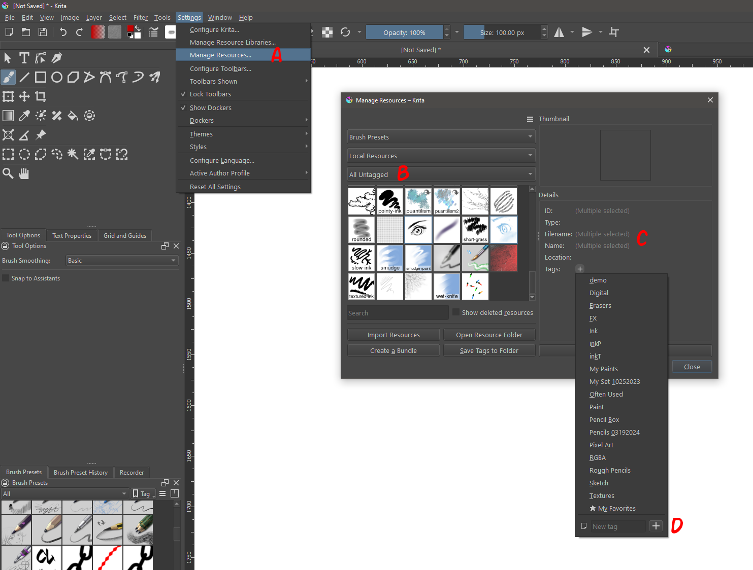 2 - With Brush Presets selected on the top menu (if it isn’t already), be sure to select “All Untagged” from the third menu. (See point “B”).
