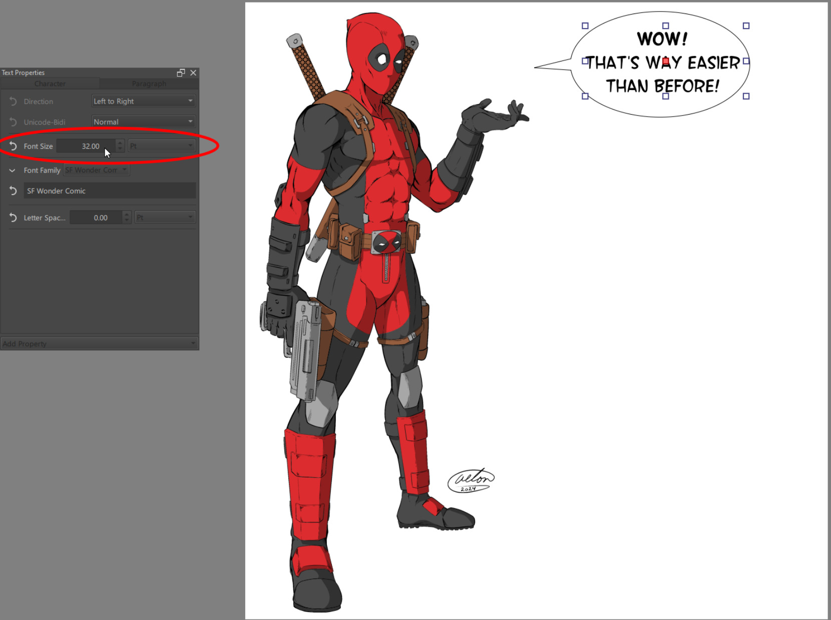 That said… Even if you use the daily build (as it currently stands) You’re still going to have an issue with what you’re attempting to do, as there still doesn’t seem to be a way to simply drag the corner of the text boxes and resize the font box (along with the text). Maybe that’s something wolthera could look at it? I’m not sure what the technical aspects of it would be. The good news is using the Daily build version scaling the font becomes exponentially easier to do. Instead of having to select the text box and then entering the editor, you can now just select the text box and scroll your middle mouse wheel over the Font Size number on the new Text Properties docker (not to be confused with the Tool Options Docker). I’ve pointed this out in the attached image. Doing so, will increase/decrease the font scale by one point, each click of the roll.