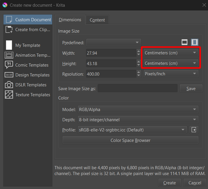 When you’re creating a document, you can change the measurements on the right of where you enter the numbers.